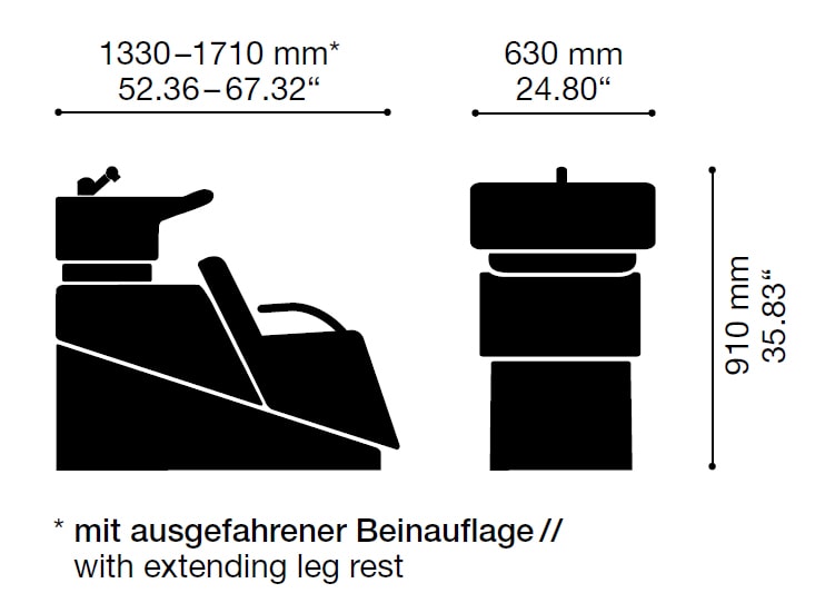 Stevige zitting en rugleuning, gesloten armleuningen, rugleuning met sierstiksel, elektrische of handmatige beensteun, kantelbare wasbak wit of zwart met kleurbeker, naar keuze met Basic of Edition mengkraan, interne doucheslang.